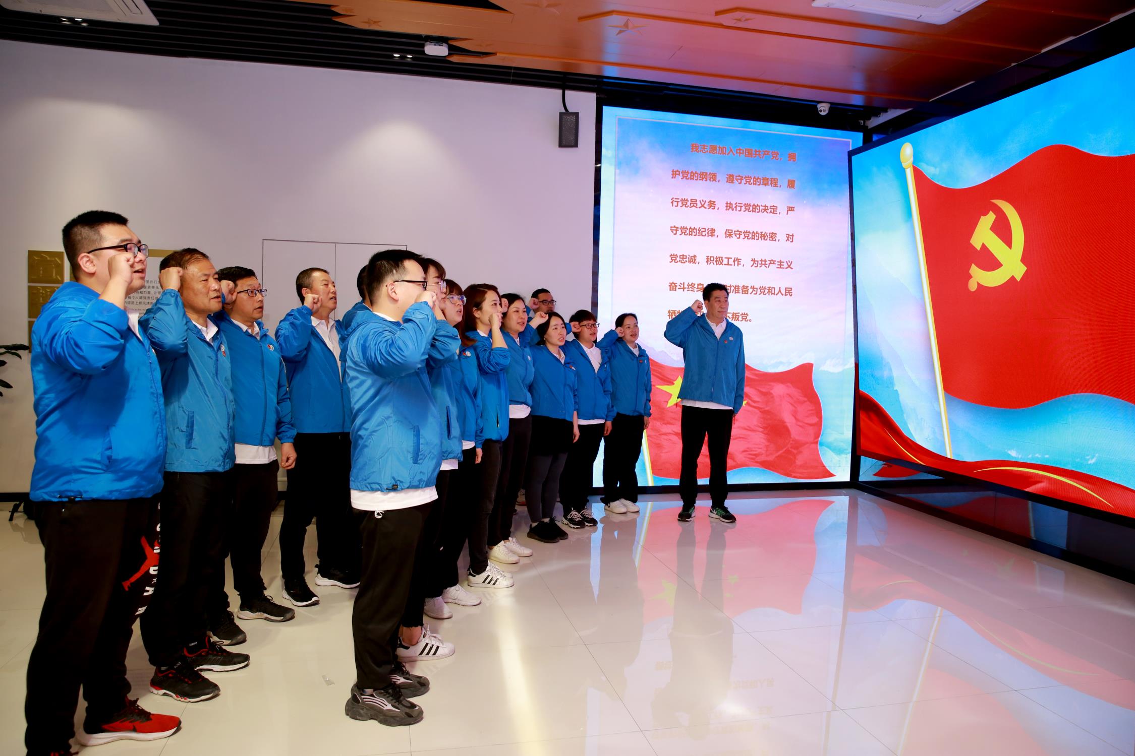 在宣誓廳中,全體黨員面向黨旗,舉起右手莊嚴宣誓。一字一句擲地有聲,重溫入黨初心。